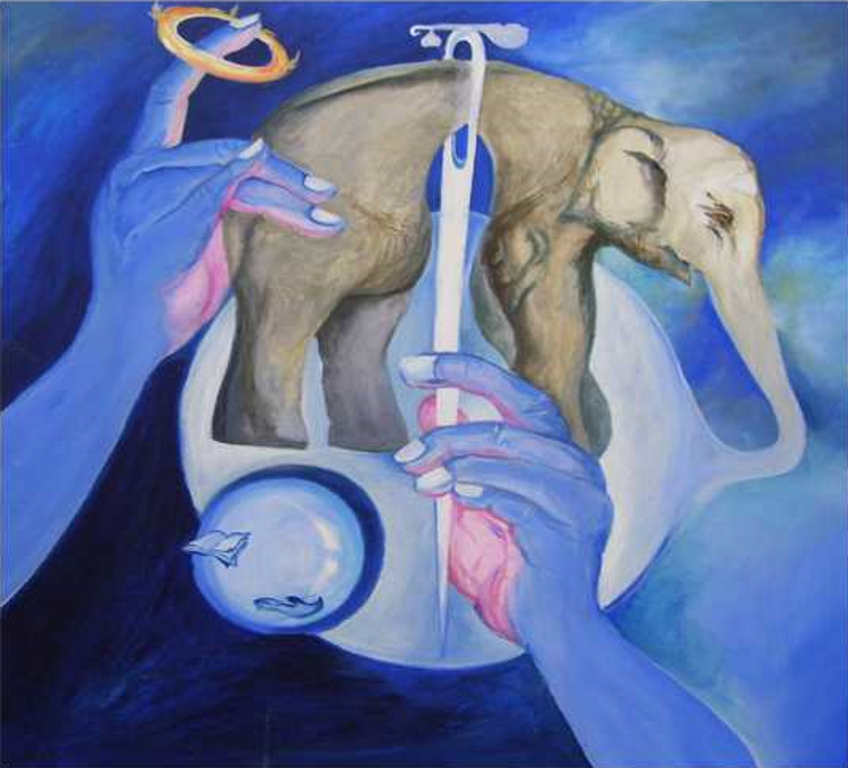 This illustration is the world of Malaysian artist and poet Ashok Kumar Nandy, whose works range from basic human expressions to topics that delve into the synthesis of science and spirituality. Elephant Through The Eye Of A Needle is a depiction of a narrative found in the Vedic literature on the sublimity of faith and the endurance of the wisdom of humility over impudent scholarship. In brief, the brahman (a Hindu priest), as symbolised by the book in the illustration, when informed that God was threading an elephant through an eye of the needle reacted with disbelief and decried the account as an incredible tale, as he felt that it was impossible for such an to take place. The cobbler, on the other hand, as symbolised by the shoe, responded to the same account with praise and marvel, explaining his belief of the omnipotence of the Almighty by pointing to the development of a banyan tree from a tiny seed. The priest despite his erudition in scripture lacked faith in the goal of the scripture, but had instead confined the ability of the Almighty to his own powers of observation, while the cobbler understood the purport of the scripture.